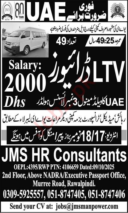 JMS HR Consultant OEP is hiring LTV Drivers for Abu Dhabi. The job advertisement was published on 16 November 2025 in the Daily Express Newspaper.