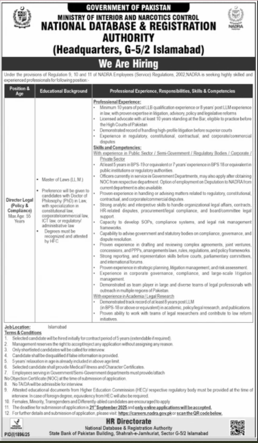 Only male candidates can apply for Ministry Of Interior Jobs In Islamabad September 2025 Qualification /Experience Required:Master of Laws (LL.M.)Preference will be given to candidates with Doctor of Philosophy (PhD) in Law with specialization in constitutional law, corporate commercial law ICT law or regulatory administrative law Degrees must be recognized and attested by and more experienced candidates should apply before 21 September 2025.