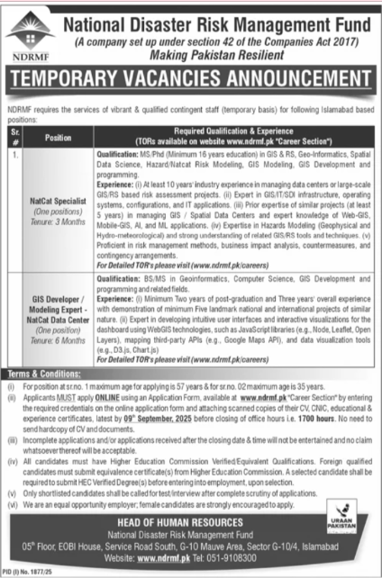 Only male candidates can apply for National Disaster Risk Management Fund Company Jobs In Islamabad 2025 Qualification /Experience Required:Qualification: MS Phd (Minimum 16 years education) in GIS & RS, Geo-Informatics, Spatial Data Science, Hazard/Natcat Risk Modeling, GIS Modeling. GIS Development and programming.Experience: (1) At least 10 years’ industry experience in managing data centers or large-scale GIS/RS based risk assessment projects. (ii) Expert in GIS/IT/SDI infrastructure, operating systems, configurations, and IT applications. (iii) Prior expertise of similar projects (at least and more experienced candidates should apply before 09 September 2025.