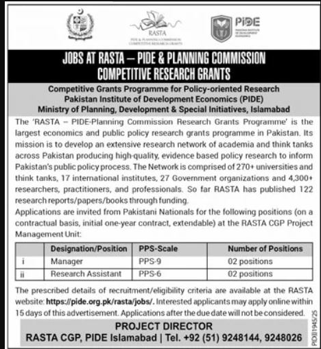 Only male candidates can apply for Pide And Planning Commission Jobs In Islamabad September 2025 Qualification /Experience Required: The ‘RASTA PIDE-Planning Commission Research Grants Programme’ is the largest economics and public policy research grants programme in Pakistan. Its mission is to develop an extensive research network of academia and think tanks across Pakistan producing high quality, evidence based policy research to inform Pakistan’s public policy process. The Network is comprised of 270+ universities and think tanks, 17 international institutes, 27 Government organizations and 4,300+and more experienced candidates should apply before 21 September 2025.