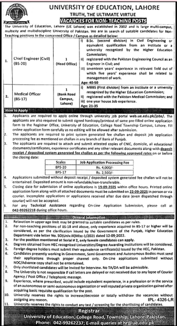 Only male candidates can apply for this University of Education Lahore Jobs In Lahore September 2025 Qualification /Experience Required: B.Sc. (second division) in Civil Engineering or equivalent qualification from an institute or a university recognized by the Higher Education Commission; registered with the Pakistan Engineering Council as an Engineer in Civil; and seventeen years’ experience in relevant field out of which five years’ experience shall be related to management of work. Age Limit: 40-50 MBBS (First division) from an institute or a university recognized by the Higher Education Commission; registered with the Pakistan Medical Commission; and iii) one year house Job experience., and more experienced candidates should apply before 19 September 2025.